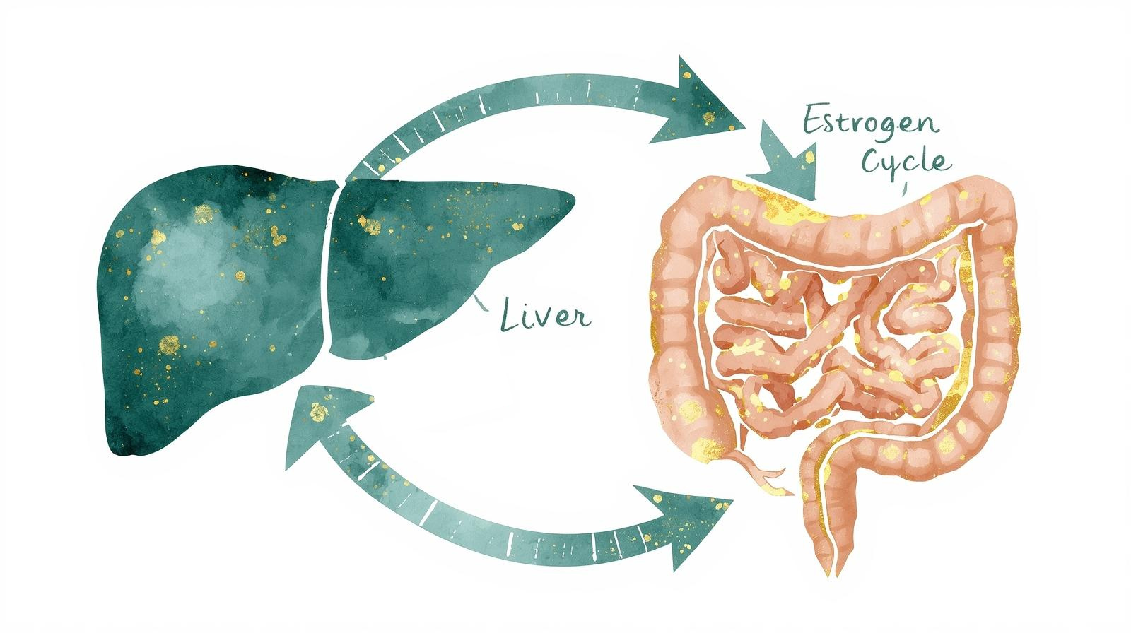 Here's the short version of how it works: Estrogens are processed in your liver, conjugated (chemically bound up and deactivated), and then sent into your intestines for excretion. But certain gut bacteria produce an enzyme called beta-glucuronidase (β-glucuronidase) that can snip those conjugates apart — deconjugating the estrogen and releasing it back into circulation in its active form. This process is part of what's called the enterohepatic circulation of estrogens.